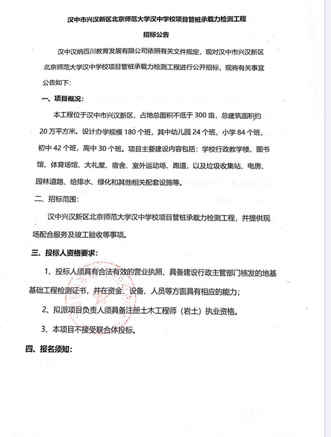 漢中市興漢新區(qū)北京師范大學漢中學校項目管樁承載力檢測工程招標公告  漢中漢納百川教育發(fā)展有限公司...